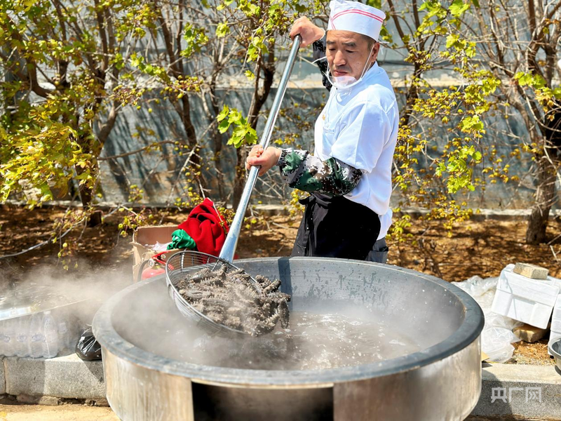 现场设置6口海鲜蒸煮大锅,以自助形式供应现捕海参(央广网见习记者徐子茗 摄)